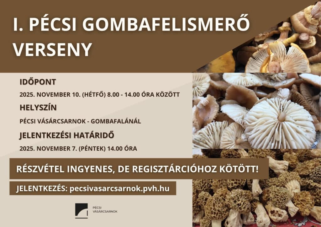A Pécsi Vásárcsarnokban november 10-én, hétfőn, reggel 8 és délután 14 óra között kerül megrendezésre az I. gombafelismerő verseny!